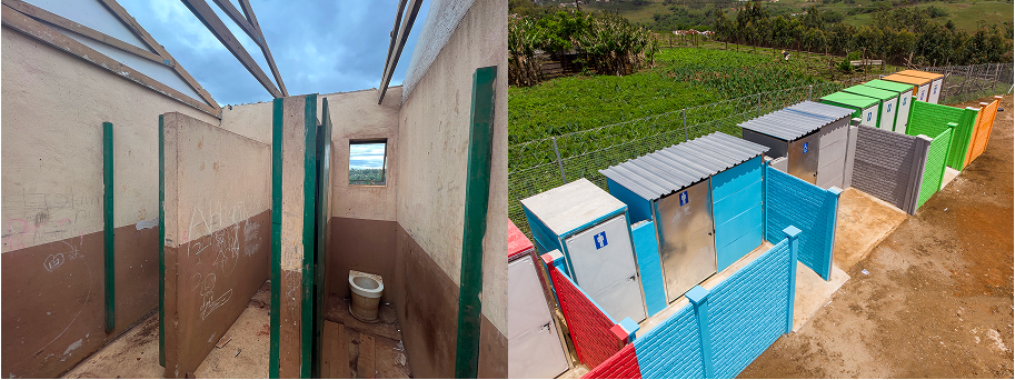 De gevaarlijke, vervallen latrines van deze plattelandsschool hebben we vervangen door veilige, menswaardige spoeltoiletten.